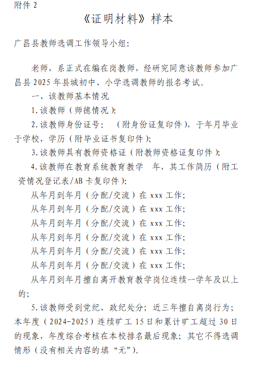 附件2:广昌县2025年县城学校选调教师《证明材料》样本