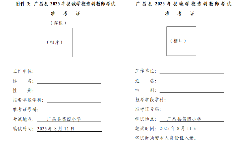 附件3:广昌县2025年县城学校选调教师笔试准考证